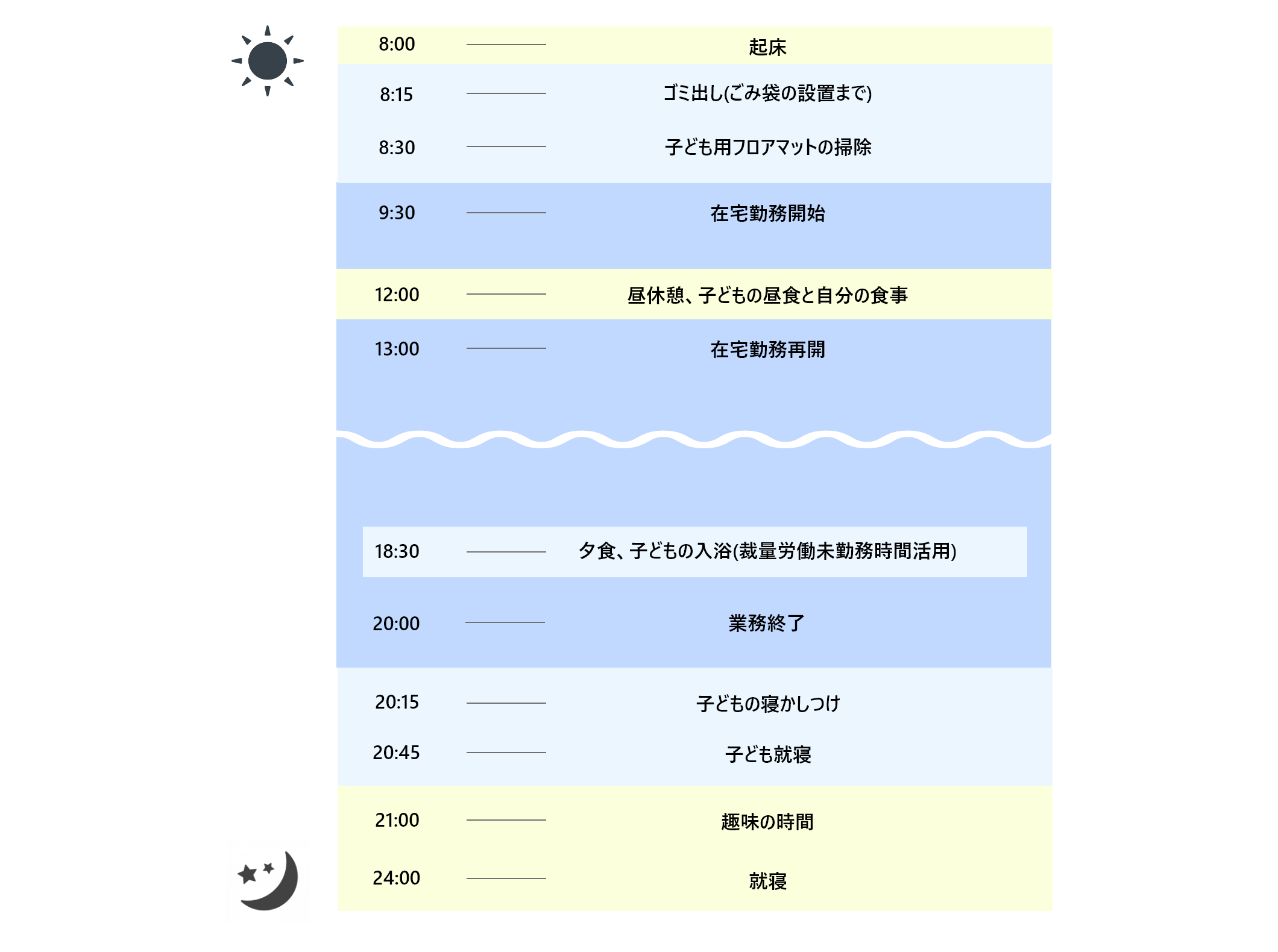 私は育休取得以前から裁量労働制であり、現在は在宅勤務です。