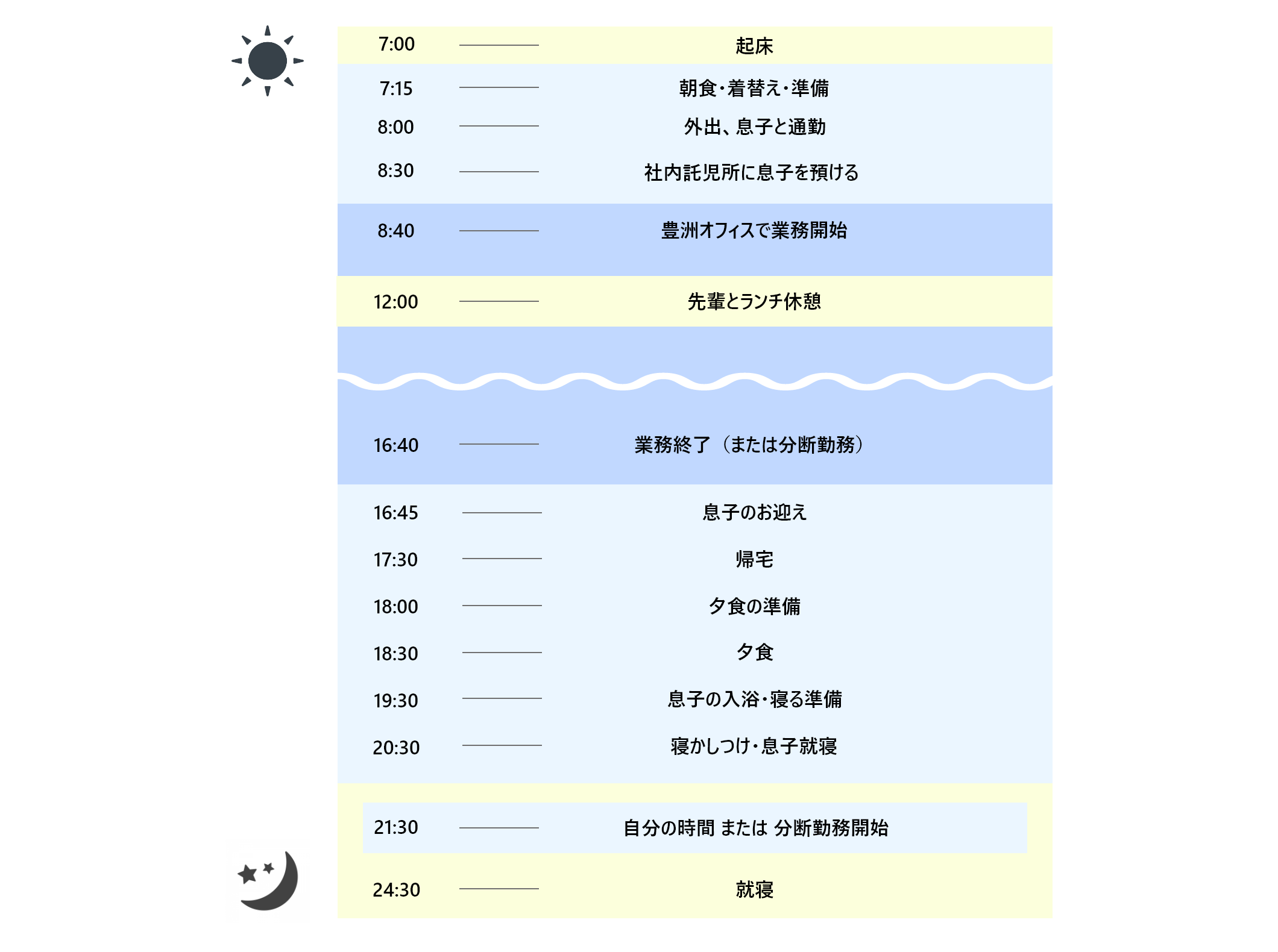 裁量労働勤務未時間という仕組みを使って、業務の合間に子どもを入浴させたり、食事を食べさせたりしながらライフとワークの両立を目指しています。