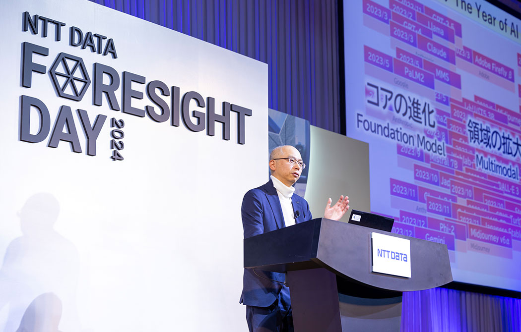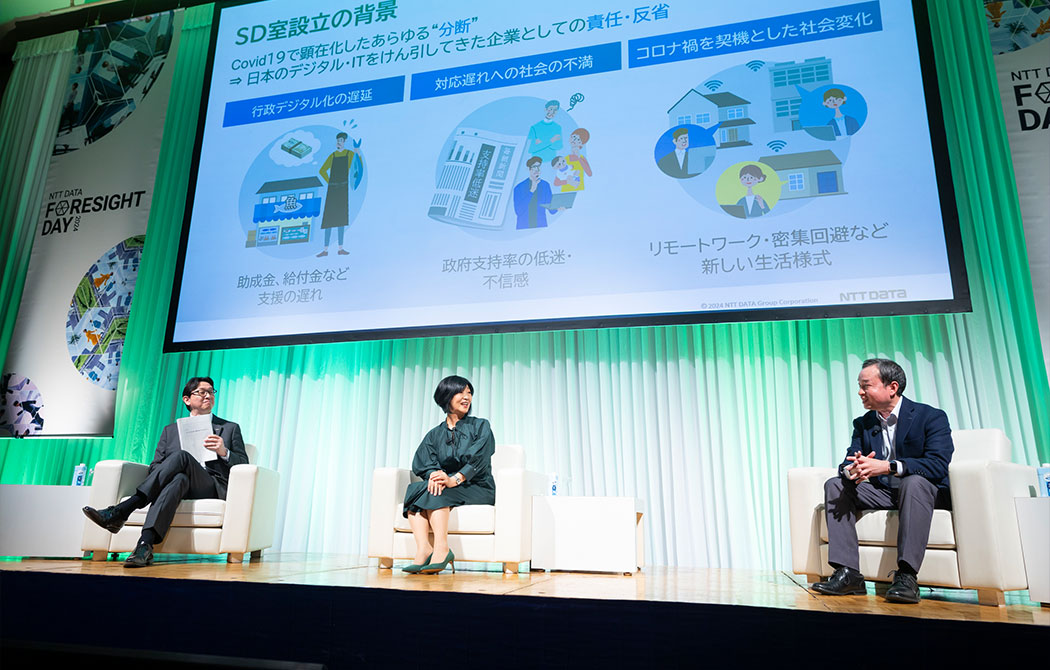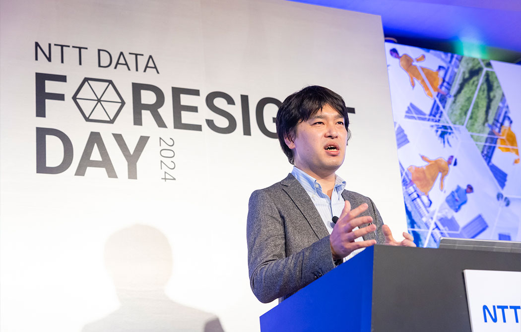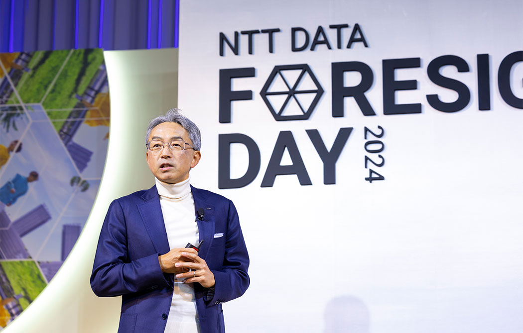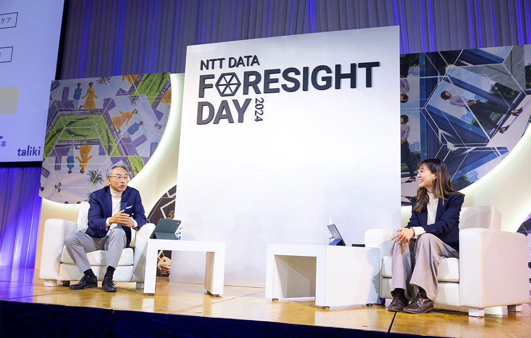 対談を踏まえて、佐々木は「より豊かで調和のとれた社会の実現に向けて、従来の業界に縛られず、より高い視座で社会課題を見つめ直す必要がある」と話し、「NTTデータは『社会変革プロデューサー』として、Foresightをベースに業界を横断し、プレイヤーを巻き込むことで実現に近づけていく」という想いが語られました。