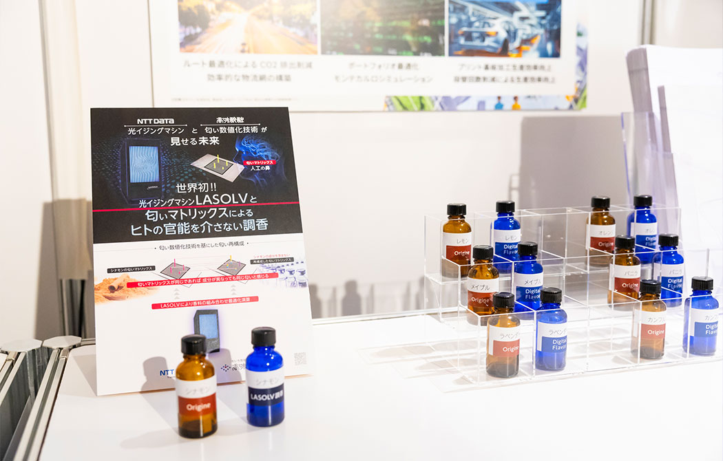 また、新たな技術が顧客接点を生み出すという展望もあります。当日は、来場者が実際にテクノロジーを体感できる展示がいくつも用意されていました。いずれも、実際に目で見て・触れて・感じることができるという体感・体験のUXを追求した技術ばかり。「におい・かおり産業のDX」の展示では、大阪大学発のベンチャー企業である株式会社香味醗酵との共同開発による“香りの数値化”と、量子コンピュータの組み合わせ最適化計算技術を用いた“数値化された香りの再構成”を体感することができました。少量の香料でさまざまな匂いを多様な場所で再現するなど、エンターテインメント領域やヘルスケア領域への活用が想定されていますが、五感データの活用はまだまだ可能性が広がっていく分野です。今後のビジネスへの拡大についても期待が大きいと言えるでしょう。