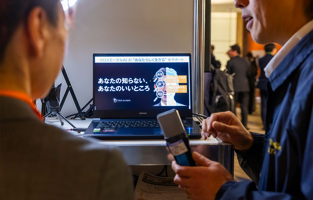 その他、リアルに生成されたデジタルヒューマンによって生身の人間に近いインタラクティブな会話・コミュニケーションが可能な「生成AIと3Dアバターを活用したデジタルヒューマン」や、クロスモーダルAIを活用して話者の会話内容や表情・声を統合的に解析し個性を可視化したニックネームを生成できる「ニックネーム生成AI」、タブレット端末のカメラで手軽にウェルビーイング度を可視化できる「Face.ing®」など、生成AIをはじめとした最新技術が体験できる展示ブースでは開発担当者と来場者の間で活発なコミュニケーションが生まれていました。技術的な背景やビジネスへの転用について生の声をやり取りできる場となり、展示ブース周辺は大盛況となりました。