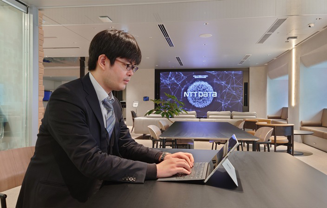 NTTデータを選んだのは、OB訪問の際に伺った内容に共感したことが一番の理由です。特に印象に残っているのは、自分たちだけでなくお客様も幸せにすることはもちろん、さらにはお客様の先にいるお客様、つまりエンドユーザーも幸せになるようなシステム開発を目指しているというお話でした。狭い範囲ではなく、社会全体をよりよくしていきたいという強い意志を感じ、NTTデータなら私の想いを実現できると思って入社を決めました。