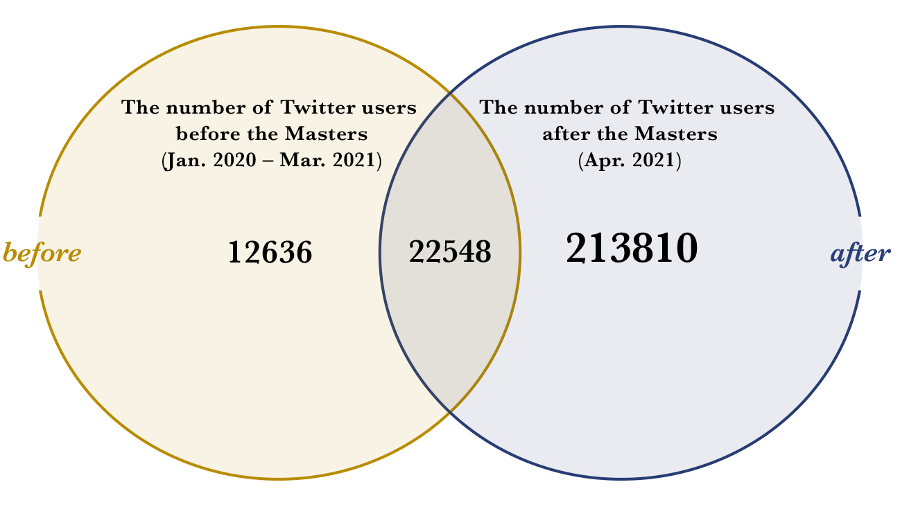 Of the 35,184 users who spoke about Matsuyama before he won the Masters, 2,595 (7.4%) had “golf” or “golf” on their profiles, but of the 226,446 users who spoke about Matsuyama after he won, 8,066 (3.6%) had “golf” or “golf” on their profiles. The demographic that was not interested in golf up until then also seemed to become interested in golf after Matsuyama’s victory.