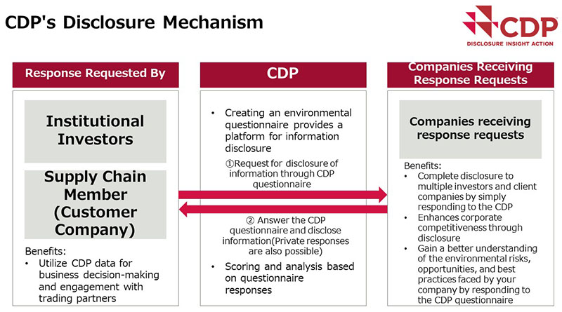 At the request of institutional investors engaging in ESG-related investments and other activities, as well as companies with strong environmental interests, CDP prepares and publishes an ‘Environmental Questionnaire’ (below). This is then sent to its portfolio companies and business partners.