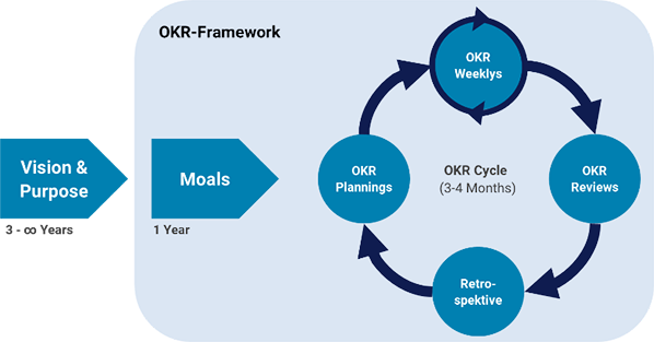 The core elements of the OKR framework are the agile OKR ceremonies, which run in a clear cycle for an established goal management process. Medium-term annual goals (objectives) fundamentally indicate the direction in which the company would like to develop. The annual goals are achieved in fixed, usually three-month OKR cycles. An OKR cycle begins with OKR Planning to align the goals and operationalize them with measurable 3-month targets. In line with the agile way of working, the operationalization of the goals is accompanied by weekly reviews, reviews of goal achievement and internal retrospectives.