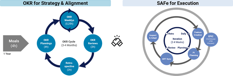 The similarities between the two frameworks are obvious (see graphic). While OKR focuses on operationalizing the strategy in an outcome-oriented 3-month cycle, SAFe pursues the purpose of setting up an agile organizational model for product/service development in a likewise 3-month cycle. Both frameworks cascade in four steps across all hierarchy levels and end with the same element that unites both frameworks - the specific tasks of the employees.