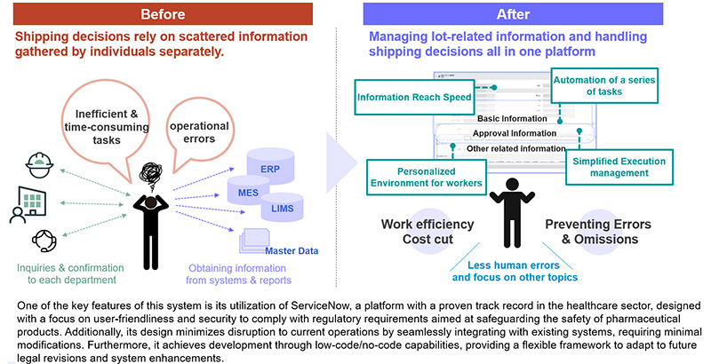 This system aligns with the revised pharmaceutical regulations issued in August 2021, aiming to meet the high-quality assurance standards for pharmaceutical manufacturing. Leveraging the integrated platform "ServiceNow®," it integrates multiple internal IT systems to centrally manage various event information that affects product quality, such as manufacturing records and quality test results associated with batches of shipment-inspected products.