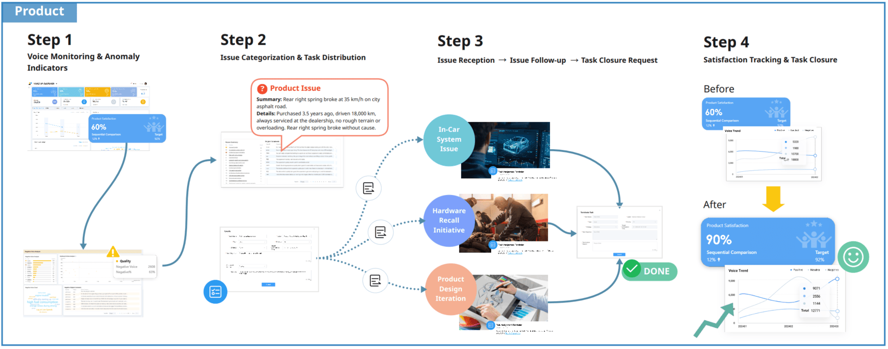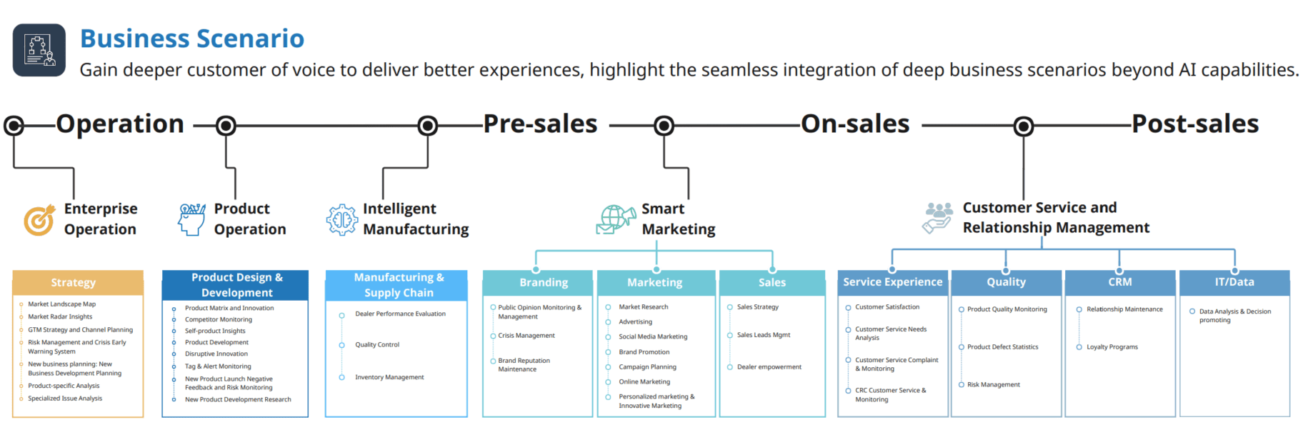 The charm of the VOC solution also lies in the fact that its application extends beyond this, offering a multitude of scalable business applications. We truly recognize the potential of VOC solution to elevate businesses to new heights of customer satisfaction, market responsiveness and corporate operation. It is a beacon of innovation, guiding enterprises through the complex landscape of customer voices with clarity, precision, and an unwavering commitment to excellence.