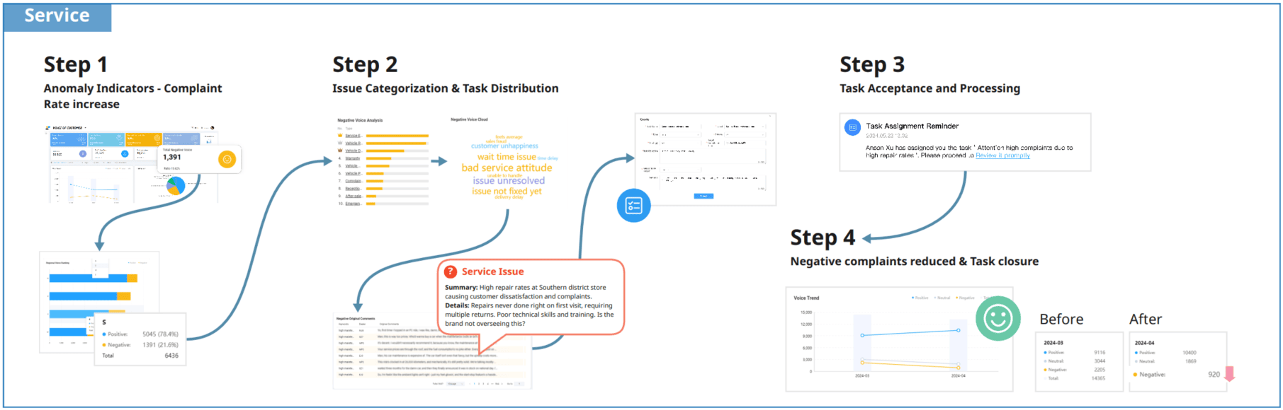 Once anomalies are detected such as the complaints, they are categorized into specific complaint types. This categorization is crucial for visualizing the current state of service experience issues. Following this, tasks are distributed accordingly, either through work orders for immediate resolution or systematic alerts for issues that require a monitoring period.