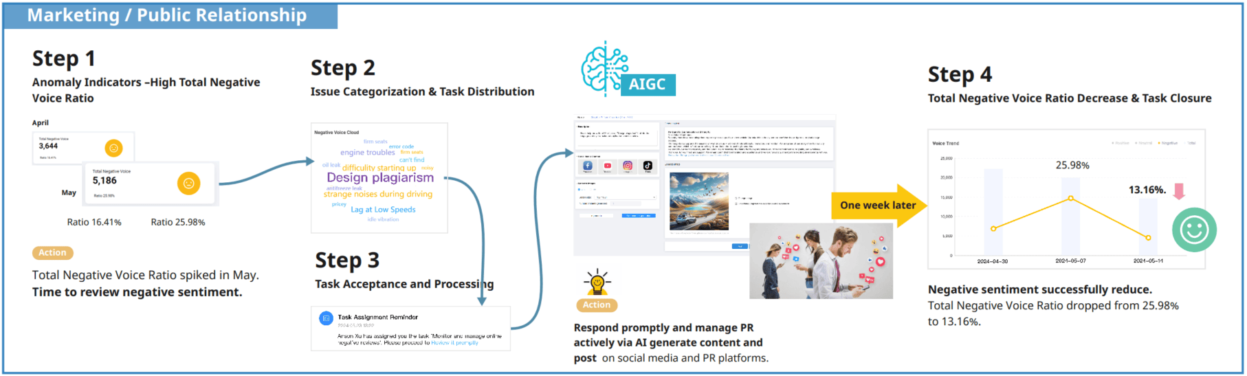 The certain reduction in negative sentiments indicates the appropriate actions. This provides the evidence to close the task, ensuring a close-loop solution to Marketing and PR.