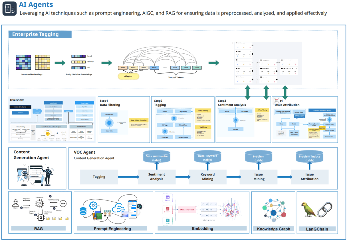 At the heart of our VOC solution lies the AI agent technologies, including RAG, Prompt Engineering, Embedding, Knowledge Graph, and LangChain, which provide the cognitive framework and processing power that enable AI agents to efficiently analyze, understand, and applied effectively of customer voice.
