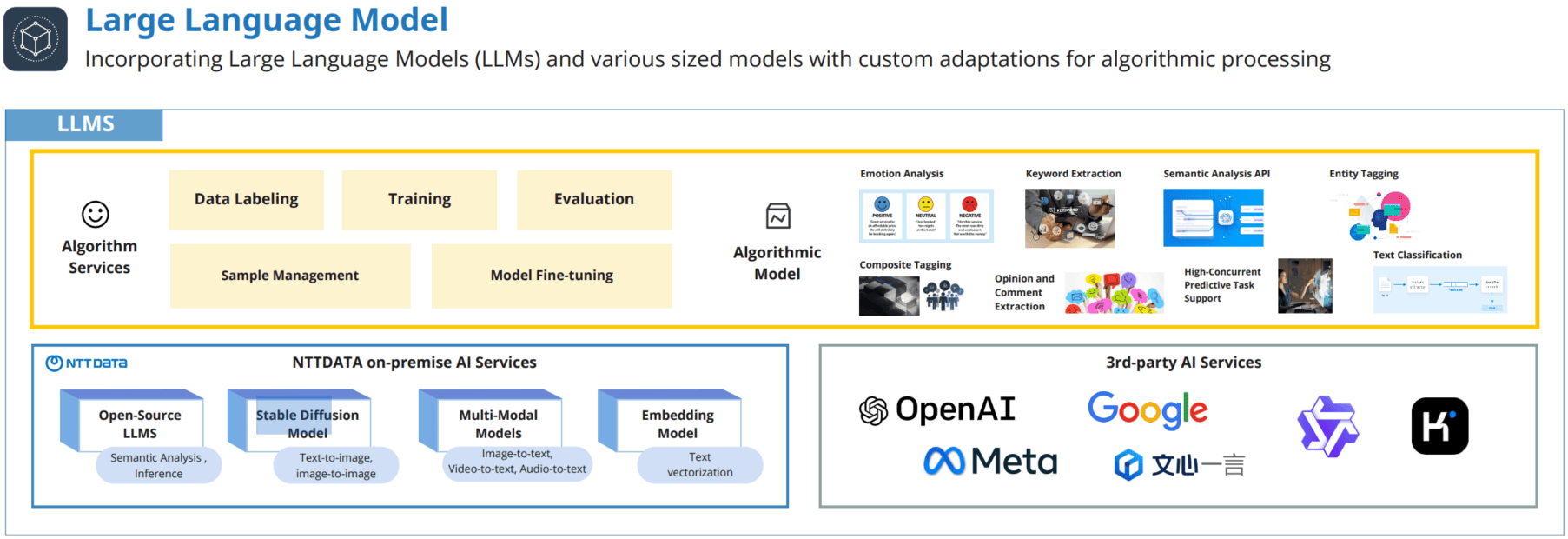 The VOC solution leverages large language models (LLMs) and diverse AI services. NTT DATA algorithm services include data labeling, training, evaluation, sample management, and model fine-tuning, ensuring robust and accurate AI models. The algorithmic model encompasses advanced functionalities like emotion analysis, keyword extraction, semantic analysis, entity tagging, composite tagging, opinion and comment extraction, high-concurrent predictive task support and text classification to comprehensively understand customer voice. NTT DATA on-premise AI services offer cutting-edge capabilities, including open-source LLMs for semantic analysis, stable diffusion model for text-to-image conversions, multi-modal models for media processing, and embedding models for text vectorization. Additionally, we integrate third-party AI services from leading providers such as OpenAI, Google, Meta, Kimi and Ernie Bot, enhancing our solution with their state-of-the-art technologies.