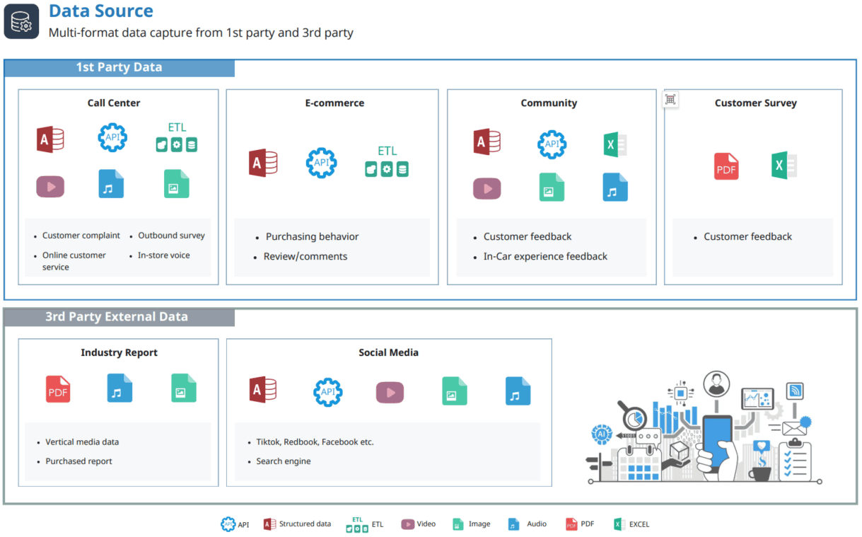 In the VOC system, data sources are primarily divided into 1st Party Data and 3rd Party External Data. 1st Party Data encompasses information directly collected from various customer interaction channels, including call centers, e-commerce platforms, community feedback, and customer surveys. This data includes customer complaints, outbound surveys, online customer service interactions, in-store voice recordings, purchasing behavior, product reviews, comments, and in-car experience feedback. 3rd Party External Data consists of industry reports and social media insights. Industry reports provide vertical media data and purchased reports that offer broader market insights. Social media data, gathered from platforms such as TikTok, Redbook, and Facebook, along with search engine results, captures customer opinions from external sources. Through the application of ETL processes, this diverse data is extracted, refined, and transformed into a structured format that is conducive to analysis. The ETL methodology-short for Extract, Transform, Load-serves as the backbone of our data integration strategy, systematically pulling data from disparate sources, converting it into analyzable information, and subsequently warehousing it within the database. API is utilized as well for facilitating the extraction of this diverse data, and Web Scraping is also harnessed to extract information, especially suitable for sites that do not offer an API interface. Each data type is well transformed and integrated into a coherent format that facilitates comprehensive data analysis. This conversion and processing of multi-modal data ensure that diverse sources of information are uniformly prepared and analyzed, providing a holistic view of the customer insights.