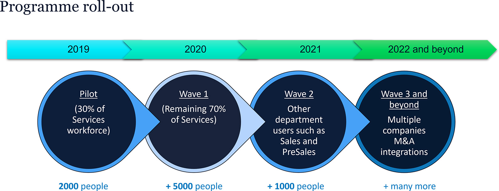 The picture below gives a high-level overview of the entire Programme rollout in different waves where each wave of the rollout covered a progressive set of mass users to increase adoption and make it an organization-wide initiative.