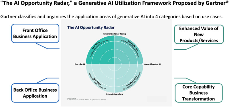 Gartner® divides potential applications into four categories. Ambitious initiatives are sorted into the "Game-Changing" category: including those aimed at creating new value in products and services or reshaping core business functions - and this is an area of rapid development. However, the most practical entry point is the "Everyday" category. This covers routine use cases such as generating and summarizing call center responses, drafting proposals and diagrams, searching internal policies, and preparing meeting minutes and reports.