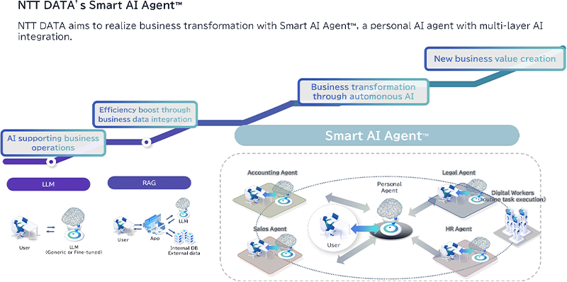 NTT DATA envisions a future in which AI agents autonomously extract, organize, and execute tasks across entire workflows. Based on our "Smart AI Agent™"* concept, we are introducing new generative AI services to realize this vision.