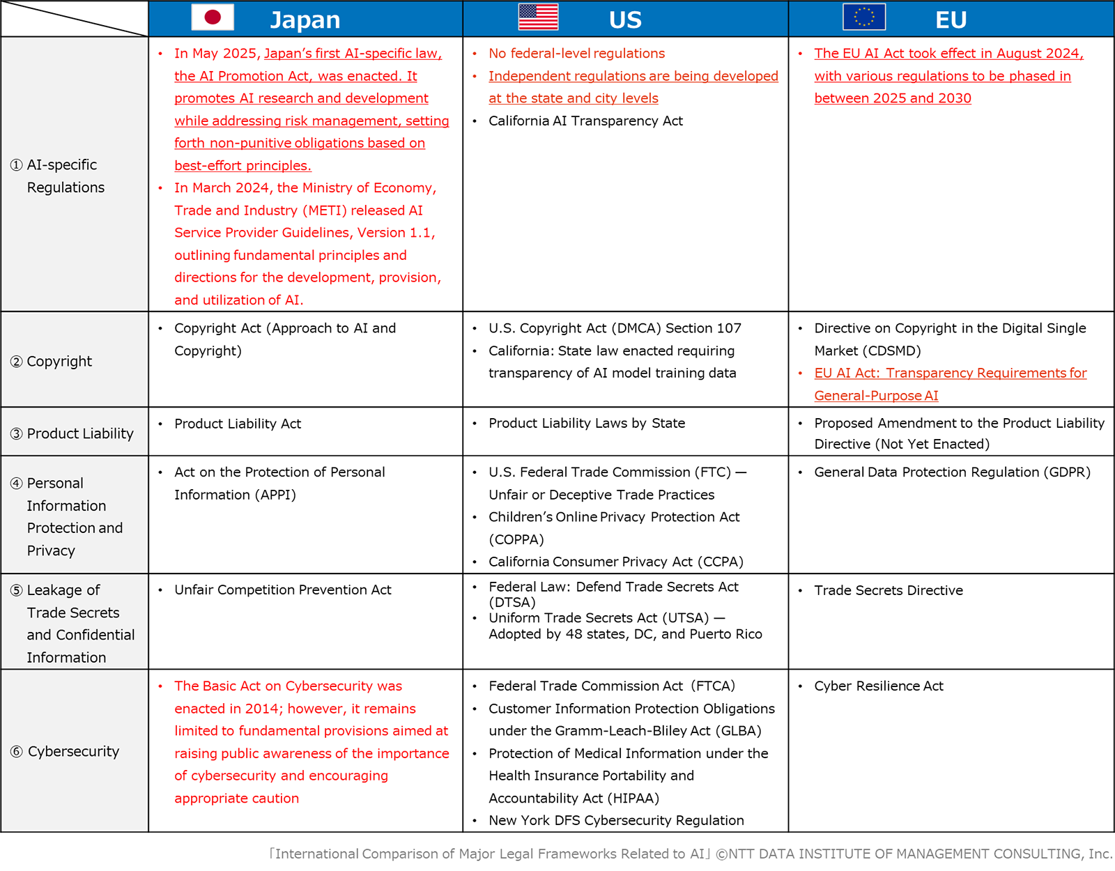That framework was short-lived. When the Trump administration took office in January 2025, it repealed EO14110 and replaced it with a new executive order aimed at "removing barriers to American AI leadership." The focus shifted away from regulatory oversight and toward boosting economic competitiveness and national security. Measures such as mandatory red team (*7) result submissions and disclosure requirements for cloud providers were suspended, reflecting concerns about excessive corporate burden. This pivot marks a clear departure from the "safe and trustworthy" lens of the previous administration, leaving U.S. AI policy in a fluid state that warrants close monitoring.