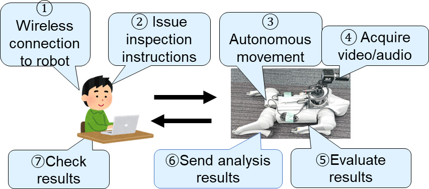 Furthermore, by using robots equipped with this technology, safe and accurate remote inspection work becomes possible. As one example, NTT DATA is conducting demonstration experiments for automatic inspection using a lightweight, four-legged dog-type robot with stable motor performance and advanced sensing functions. By pre-installing markers containing ID and position coordinate information on inspection target equipment, the robot can autonomously estimate target locations and perform inspection work. The robot automatically patrols the verification area and acquires video and audio data. The video and audio data are analyzed by a small PC on the robot's back, and finally, the inspection video and analysis results are transmitted to the PC of the operator who issued the inspection instructions.