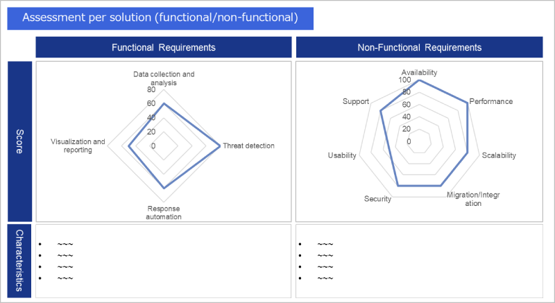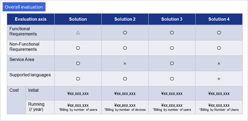 After creating the evaluation sheet, investigate each item through document reviews and interviews with vendors. Ultimately, conduct a comprehensive evaluation by organizing the scoring (e.g., "0: Not meeting requirements," "1: Meeting requirements," "2: Exceeding requirements with advantages over other solutions") and the satisfaction rate of the requirements. Also, include prerequisites for adopting the solution, such as service regions, supported languages, and costs, in the evaluation criteria (Figures 1 and 2)