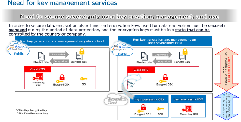 The sovereign cloud has been attracting worldwide attention since 2021. There are three sovereignties required in the sovereign cloud: data sovereignty, system sovereignty, and operation sovereignty. Key management services are an essential technical element to realize data sovereignty.