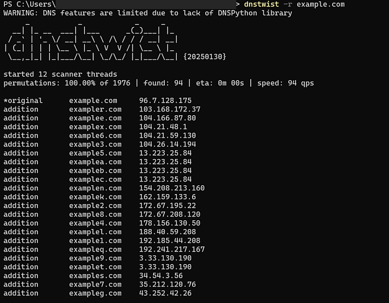 For this analysis, we used a tool called dnstwist (https://github.com/elceef/dnstwist) to scan for domains similar to "example.com," a reserved domain used for demonstration purposes.