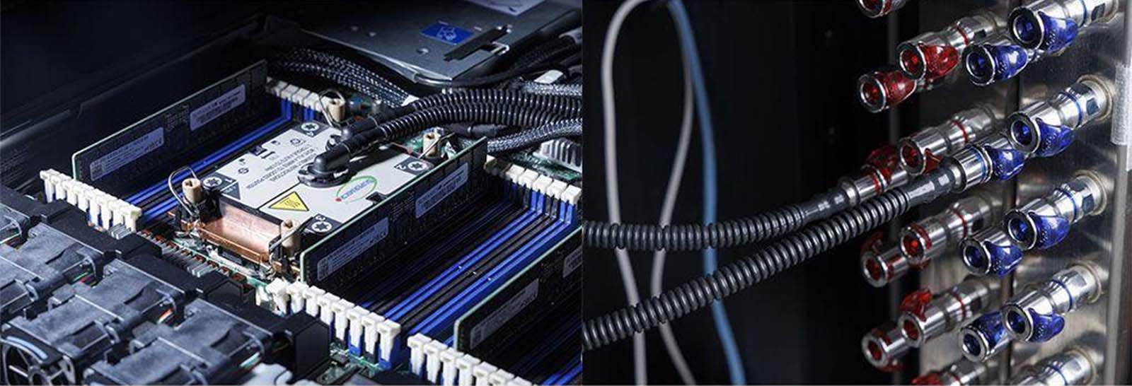 Left: With liquid-based cooling methods, coolant is circulated through cold plates attached to major heat-generating components such as GPUs and CPUs.