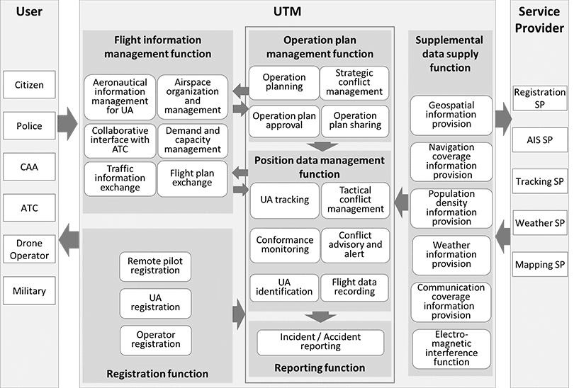 According to ISO 23629-5, UTM are organized into six functional categories, the Registration function, Flight information management function, Operation plan management function, Position data management function, Reporting function, and Supplemental data supply function.