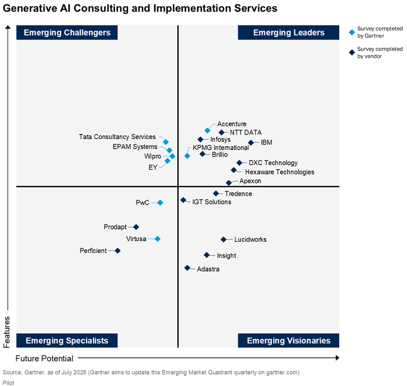 Per Gartner: "Use this Emerging Market Quadrant and companion vendor identification tool to explore the market and service provider landscape." In addition, "Gartner defines GenAI consulting and implementation services as a market focused on helping enterprises achieve tangible business results using tailored GenAI solutions."