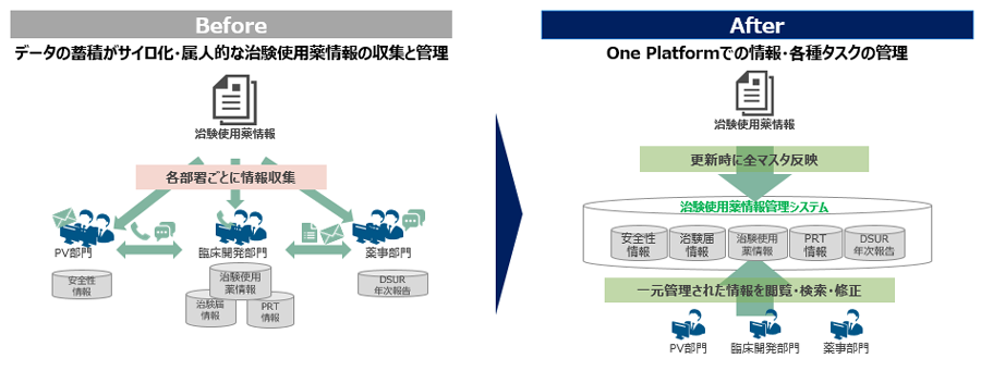 副作用等症例報告の観点で、管理範囲が他社品/市販品まで及ぶこと、試験間で複雑に関係しあう治験使用薬情報を効率的に管理することが、安全性情報管理に対するコンプライアンス違反回避に必要と考え、本目的を達成するためにシステム開発を実施しました。