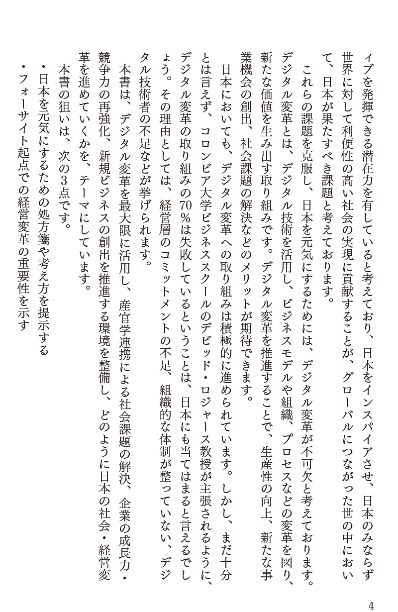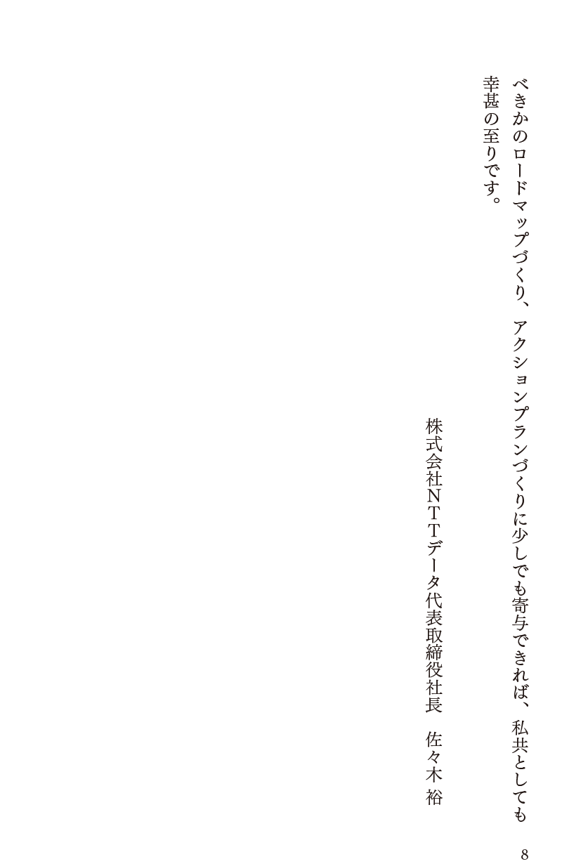 本書では「日本を元気にする処方箋」「フォーサイト起点での経営変革の重要性」「デジタルを掛け合わせた社会課題解決アプローチ」の3つを提示しており、読者の方々のロードマップづくり、アクションプランづくりに少しでも寄与できれば、私共としても幸甚の至りです。