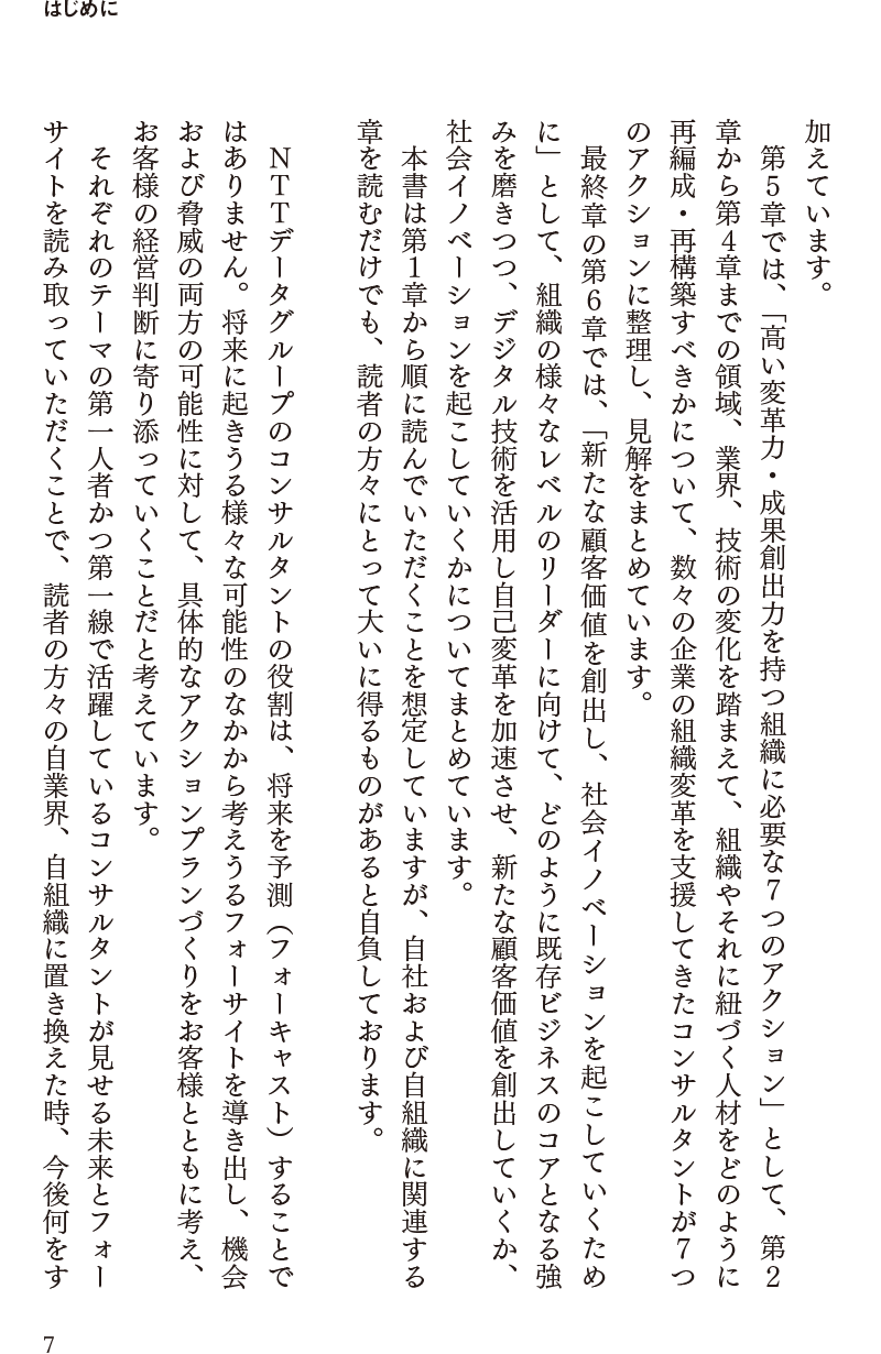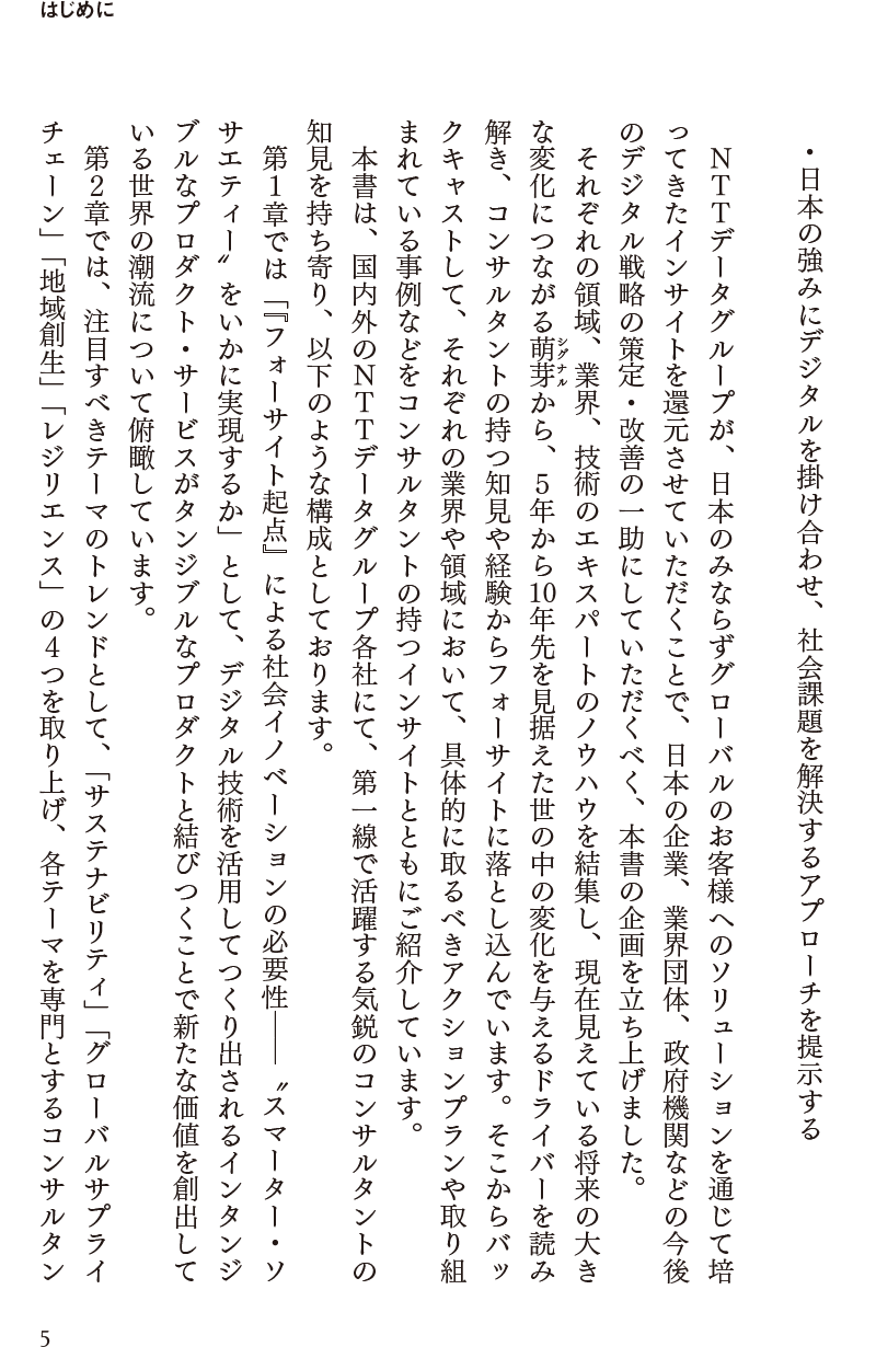 本書は、NTTデータグループのコンサルタントが、現在注目すべきテーマ、業種、テクノロジーなどについて、将来像(フォーサイト)を示し、そこからバックキャストして、「日本企業がいま、何をすべきか」を提案するものです。
