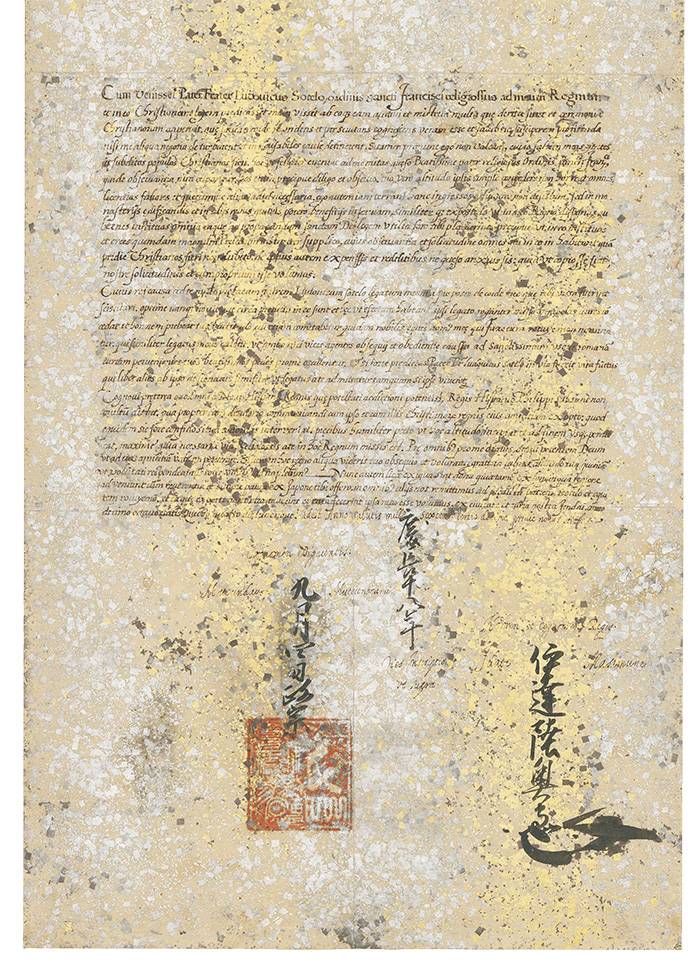 仙台藩主だった伊達政宗は、慶長18年(1613)スペイン国王、ローマ教皇のもとへと家臣の支倉常長らを大使とする慶長遣欧使節を派遣しました。「ローマ教皇宛書簡」は伊達政宗がローマ教皇パウロ5世に宛てた親書で、和文とラテン語文が用意されました。書簡には、領内への宣教師派遣の請願、メキシコとの交易のためのスペイン国王への仲介の依頼が記されています。これに対する回答は前向きではあっても検討するというものでした。いずれにしろ幕府のキリシタン禁制が強化され目的を果たせませんでしたが、日本とローマ教皇庁との外交史に残る出来事となりました。