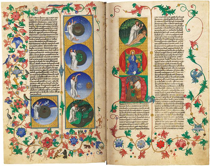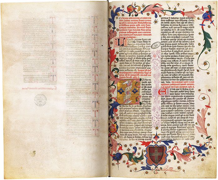『ウルガタ聖書』は、教皇ダマスス1世の依頼により、それまで不統一があった聖書のラテン語訳の改訂に取り組んだものです。旧約聖書はヘブライ語原典から、新約聖書はギリシア語原典から翻訳されました。「ウルガタ」とはラテン語で「一般に普及した」という意味で、中世ヨーロッパを通じて唯一の権威ある聖書として各国語訳の底本となり、また中世ヨーロッパ文化の根源として未来をひらく書としての役割を担いました。16世紀になると、トリエント公会議においてカトリック教会公式のラテン語訳聖書と定められました。