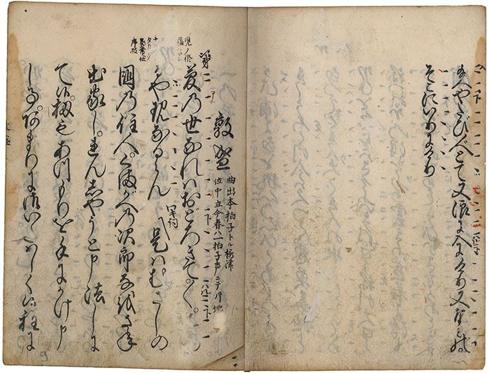 本書は、能の謡稽古に用いられる譜本の一種である謡本(うたいぼん)です。詞章を掲げ、その右側に旋律や拍子を指示する符号などが記されています。室町時代に謡が能から独立した音曲として普及、流行するのに伴い、稽古の手引書としての謡本が数多く書写されるようになりました。本書には、能の曲目である「阿漕(あこぎ)」、「敦盛」、「玉鬘(たまかずら)」、「卒塔婆小町(そとばこまち)」、「景清(かげきよ)」の五番(曲)が収められています。紹介している頁は「敦盛」の冒頭です。この曲目は、かつての源氏の武将で出家した熊谷直実(くまがいなおざね)が、一ノ谷の合戦で討ち取った平家の公達(きんだち)でわずか16歳の敦盛の菩提を弔うために一ノ谷に赴き回想にふけっている時に起こった出来事を表現した物語です。