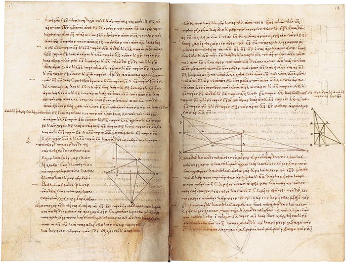 『数学集成』全8巻は、古代ギリシアにおける当時までの幾何学を対象に、後の数学者が理解できるよう、ユークリッドやアルキメデス、アポロニウスなど名高い先駆者たちの業績に注釈を加える体裁で書かれたものです。幾何学のさまざまな論題について、それまでの成果を解析すると同時に、独自の解法による補足的な解説や問題の拡張を試みています。後にパッポスの名を冠した定理も多く、ピタゴラスの定理(三平方の定理)を活用した「パッポスの中線定理」や、16~17世紀の数学者ギュルダンにより再発見された回転体の体積についての定理「パッポス・ギュルダンの定理」などが挙げられます。その解説は、簡潔、明瞭です。また、現在では散失してしまった著作からの引用も多く、数学史における貴重な史料にもなっています。古代ギリシアの数学者の業績を後世に伝える本書は、デカルトやニュートンなど多くの学者に研究され、数学の進歩に大いに役立てられました。