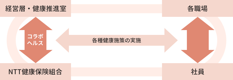 NTTデータでは、経営層、健康推進室の産業医、専門医、保健師が中心となって、健康保健組合(コラボヘルス)および各職場と協力しながら社員の健康増進やメンタルヘルスケア、感染症対策に取り組んでいます。