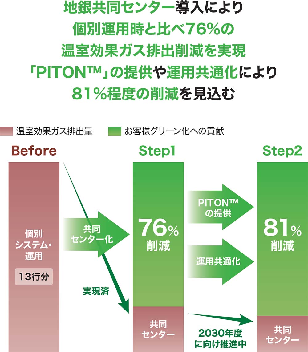 複数の地方銀行(地銀)が基幹系システムを共同利用する「地銀共同センター」によりシステムコスト削減や業務効率化、環境に配慮した取り組みを支援しています。