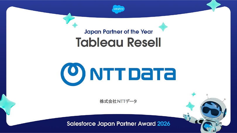 株式会社NTTデータ(以下:NTTデータ)は、株式会社セールスフォース・ジャパン(以下:Salesforce)のSalesforce Japan Partner Award 2026において、「Japan Partner of the Year - Tableau Resell -」を受賞しました。