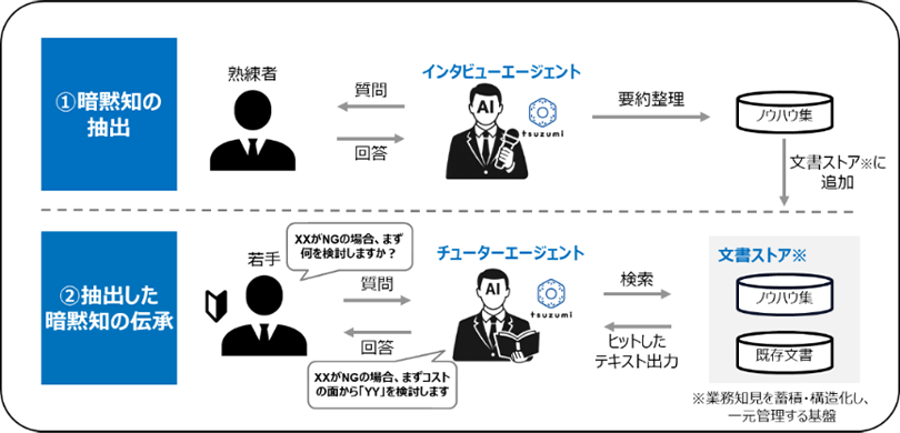 図2:AIエージェントによる暗黙知の抽出と若手への知識伝承プロセス