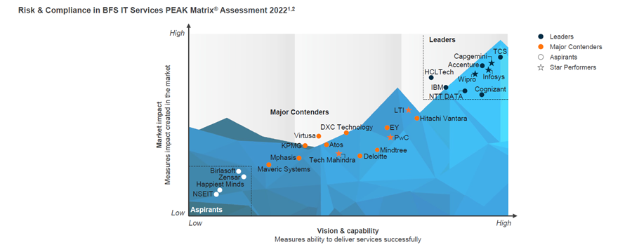 「Enterprise Risk & Compliance in BFS IT Services PEAK Matrix® Assessment 2023」は、Everest Groupが規定するRFIプロセスに基づき、大手ITサービスプロバイダーからの情報収集、各社に対するお客さまからの評価、銀行および金融サービス向けリスク・コンプライアンス管理サービス市場の徹底分析から主要ベンダー26社を評価したものです。