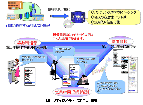 日本ATM株式会社は、ATM(現金自動預け払い機)/CD(現金自動支払機)などの自動機を企画から設置、監視、運用にいたるまで総合的にサポートする企業であり、その経験を活かし、公知の情報から全国各地のATM拠点情報を収集しました。その日本全国のATM拠点情報DBを、株式会社NTTデータが提供している携帯電話向けの地図ASPサービスである「デフォルメ道案内®」サービス※に、付加する事により、ATM案内ASPサービスを金融業界(銀行、クレジットカード、信販、消費者金融)向けに広く提供することとなりました。