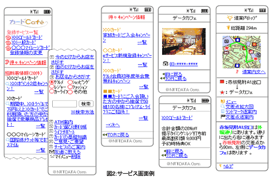 株式会社NTTデータ(本社:東京都江東区、代表取締役社長:浜口 友一)は、クレジットカード等に付帯している優待店舗情報などの情報を、携帯電話上で案内するカード情報ポータル「カードCaféTM」を、NTTドコモのiモード公式サイトとして3月1日にサービス開始しました。本サービスでは、複数のカード会社の優待店舗情報をポータルサイトとして提供するだけでなく、優待店舗情報を位置情報(緯度、経度)とともにデータベース化することで、携帯電話を持ったユーザの現在地に応じた情報を提供することが可能です。また、ユーザは情報提供料無料(※1)でサービスが利用可能です。 サービス開始時にはクレジットカード会社8社、非クレジットカード会社2社が参画し、約1万店以上の優待店舗の情報などを掲載します。NTTデータでは、今後、店舗情報をはじめとする各種情報の拡充を図りながら、Vodafone live !、ez-webについても順次公式サイトとしてサービスを提供する予定です。 iモードでのアクセス方法は「メニューリスト」-「証券/カード/保険」-「カードCafé」からアクセス可能です。 【サービスの背景】 現在、クレジットカードの発行枚数は年々伸びており、2003年では2億6000万枚、すなわちカード保有層一人あたり平均3枚ものカードを保有していると言われています。そのような中、クレジットカードの種類は多岐にわたり、マイルやポイント、割引などの特典制度も充実し、利用目的も単に「現金が手元にないから」ではなく、「クレジットカード払いの方が得だから」という理由で使われる事も多くなってきています。しかしその反面、保有するカードの付帯情報をユーザは把握しきれず、機会損失をしていることが意外と多いのが現状です。そのため、各企業では小冊子の発行やInternet(ウェブ/電子メール)での案内を実施することによって、自社カードのメリット周知を行っていますが、ユーザはそれらの小冊子などを持ち歩く習慣がほとんどありません。 「カードCafé」ではユーザが保有するカードに応じて、特典情報や新着情報、優待店情報などを位置情報とあわせデータベース化し、それをポータルサイトから提供し、簡単に検索・参照できるサービスを提供します。一方、参画企業へは共同利用型のプラットフォームを提供することにより、プロモーションコストの削減を実現させます。 | ||||||