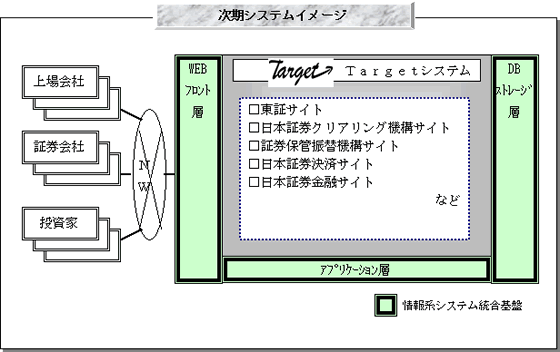 次期Target(ターゲット)システムの構築にあたっては、利便性・保守性の向上に加え、最新オープン系技術の採用といった現行システムの課題を解決するため、NTTデータの金融機関向け情報系システム構築ソリューションである「FINALUNA®(フィナ・ルナ)」(以下、「FINALUNA」という。)を全面的に採用し、NTTデータが平成16年7月に受注し、現在構築中の情報系システム統合基盤(東証情報系システムの共通・統合型プラットフォーム)(以下、「統合基盤」という。)上に構築します。