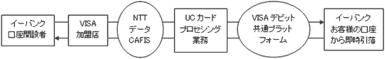 イーバンクの口座保有者が国内外のVISA加盟店において「イーバンクマネーカード(仮称)」を利用すると、VISAデビット共通プラットフォームを経由してイーバンクに利用金額や口座情報等が送信され、利用金額がお客様のイーバンク口座から原則即時に引き落とされます。