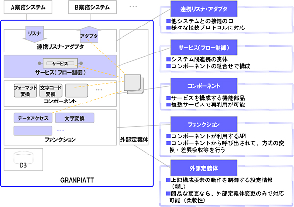 システム間の連携は、サービスとして実装します。サービスは、再利用可能な機能部品(コンポーネント)を組み合わせて構成します。コンポーネントは、共通機能として複数のサービスで再利用が可能です。コンポーネントなどの各構成要素の動作は、外部設定情報(外部定義体)によって制御できる仕組みとし、変化への強さを実現しています。