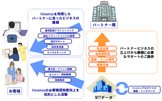 NTTデータはパートナーに対してHinemosについての営業支援、技術支援、技術者教育などのサポートを行っていきます。また、パートナー企業は、Hinemosを利用した運用監視のアウトソーシング、パートナー企業のソリューションとの連携、保守サポート、技術者派遣、コンサルティング、システムインテグレーションなどのビジネス展開を図ることができます。NTTデータでは今後、継続してパートナー体制を構築し、Hinemosを展開していく予定です。