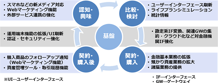 「AnserParaSOL」の導入により、金融機関は個人顧客に、金融機関取引の基本となる預金業務のほか、利用者がインターネット上で金融商品を購入(契約)するまでの行動プロセス、『認知・興味』、『比較・検討』、『購入・契約』、『契約・購入後』に対応した、最新鋭の機能・サービスを提供することができます。