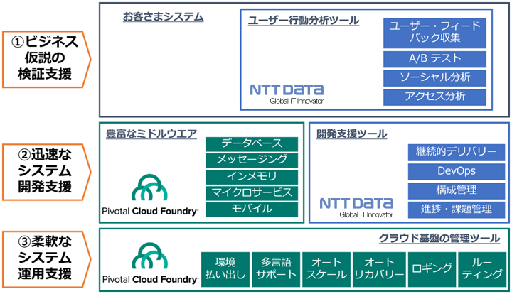 本ソリューションは、NTTデータが持つアジャイル開発基盤とPivotalの最先端のプラットフォーム機能を統合することで実現しています。システム基盤となるミドルウエアやアジャイル開発・管理支援ツール、運用開始後のシステム運用ツール、システムのユーザー行動分析ツール等、システムのアジャイル開発および運用に必要な機能をすべて提供します。