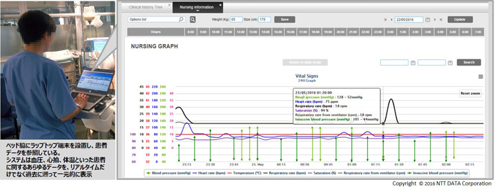 そこで、NTTデータとエヴェリスは、ICUで用いられている各種医療機器から得られる情報を一つのプラットフォームに集約し、患者に関するあらゆるデータを一元化して管理できるようにしました。この一元化された患者データを「(1)リアルタイムだけでなく過去に遡っても参照できるシステム(ICU向け拡張電子カルテシステム)」と、集約されたデータを分析して構築する「(2)症状推移予測モデルに基づくスマートアラートシステム」の開発を2015年3月からヴィルヘン・デル・ロシオ大学病院との共同研究として行っています。本(1)ICU向け拡張電子カルテシステムについて、2016年3月より同病院のICUにて実際に適用した実証実験を行い、その効果を検証しました。