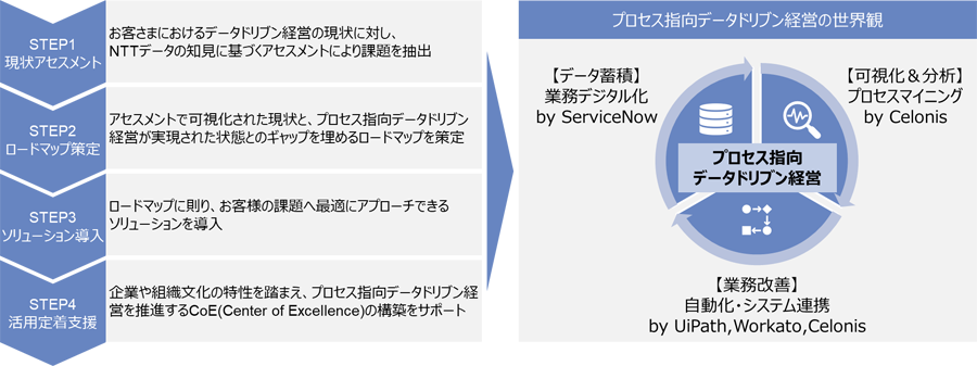 NTTデータが持つさまざまな業種の知見と独自のアセスメント結果に基づき、お客さまごとに最適なロードマップを策定し、最短距離での目標達成を支援します。さらに、企業や組織文化の特性を踏まえて、プロセス指向データドリブン経営を推進するCoE(Center of Excellence)の構築をサポートし、確実な定着を支援します。